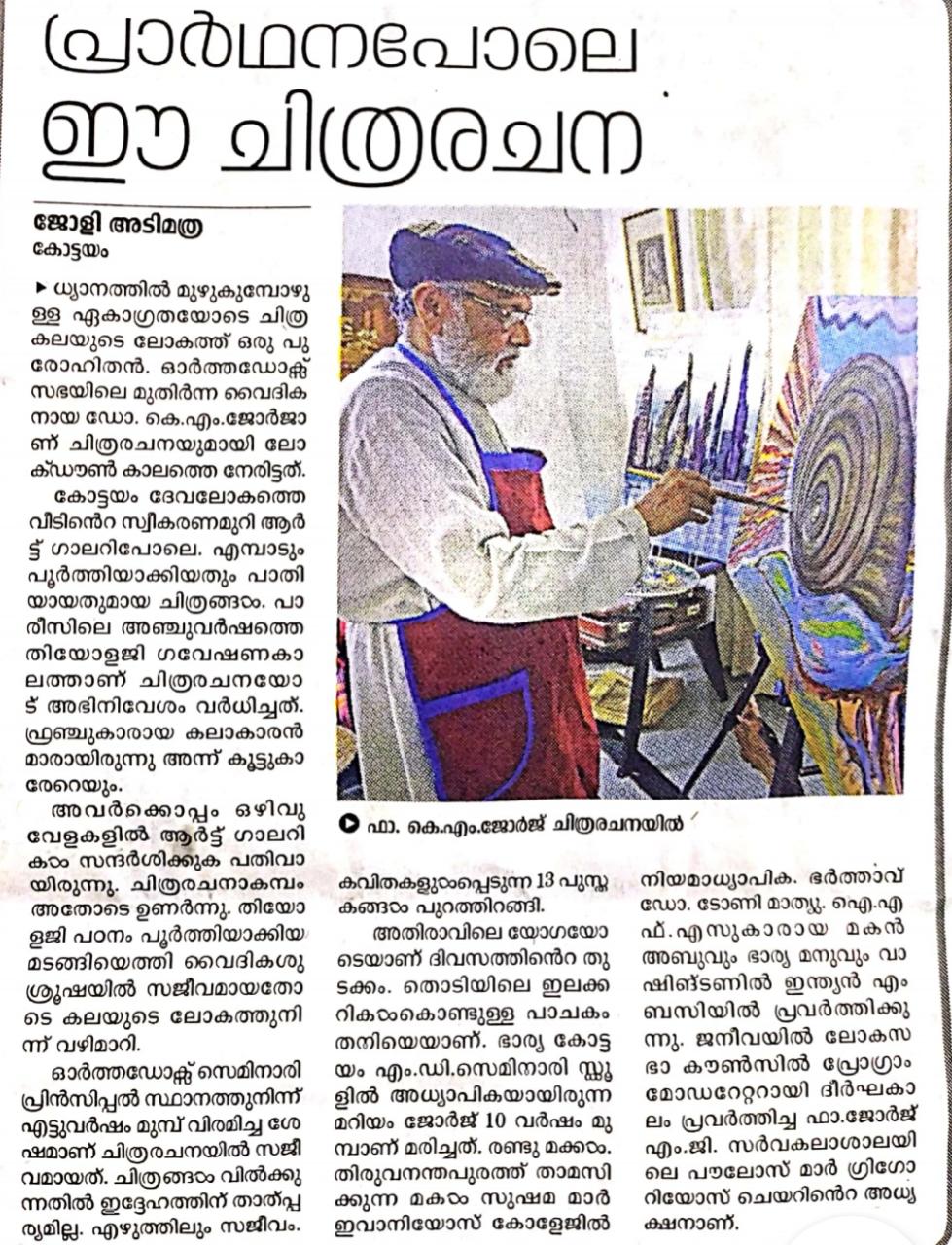 വര്ണ്ണക്കൂട്ടുകളെ പ്രണയിക്കുന്ന പുരോഹിതന് നിറക്കൂട്ടുകള് വര്ണ്ണജാലമൊരുക്കിയ വീട്. ജീവിതമിവിടെ ഒരു ധ്യാനമാണ്. ഏകാന്തതയുടെ അപാരതീരത്തെ യോഗയിലൂടെയും വര്ണ്ണപ്പെരുക്കങ്ങളിലൂടെയും പിടിച്ചുകെട്ടിയ പുരോഹിതന്- ഫാദര്. കെ.എം. ജോര്ജ്. മലങ്കര ഓര്ത്തഡോക്സ് സഭയിലെ മുതിര്ന്ന വൈദികനും പ്രമുഖ ദൈവശാസ്ത്രജ്ഞനുമായ ഫാദര് ലോക്ഡൗണ് കാലത്തെ നേരിട്ടത് ബ്രഷും …